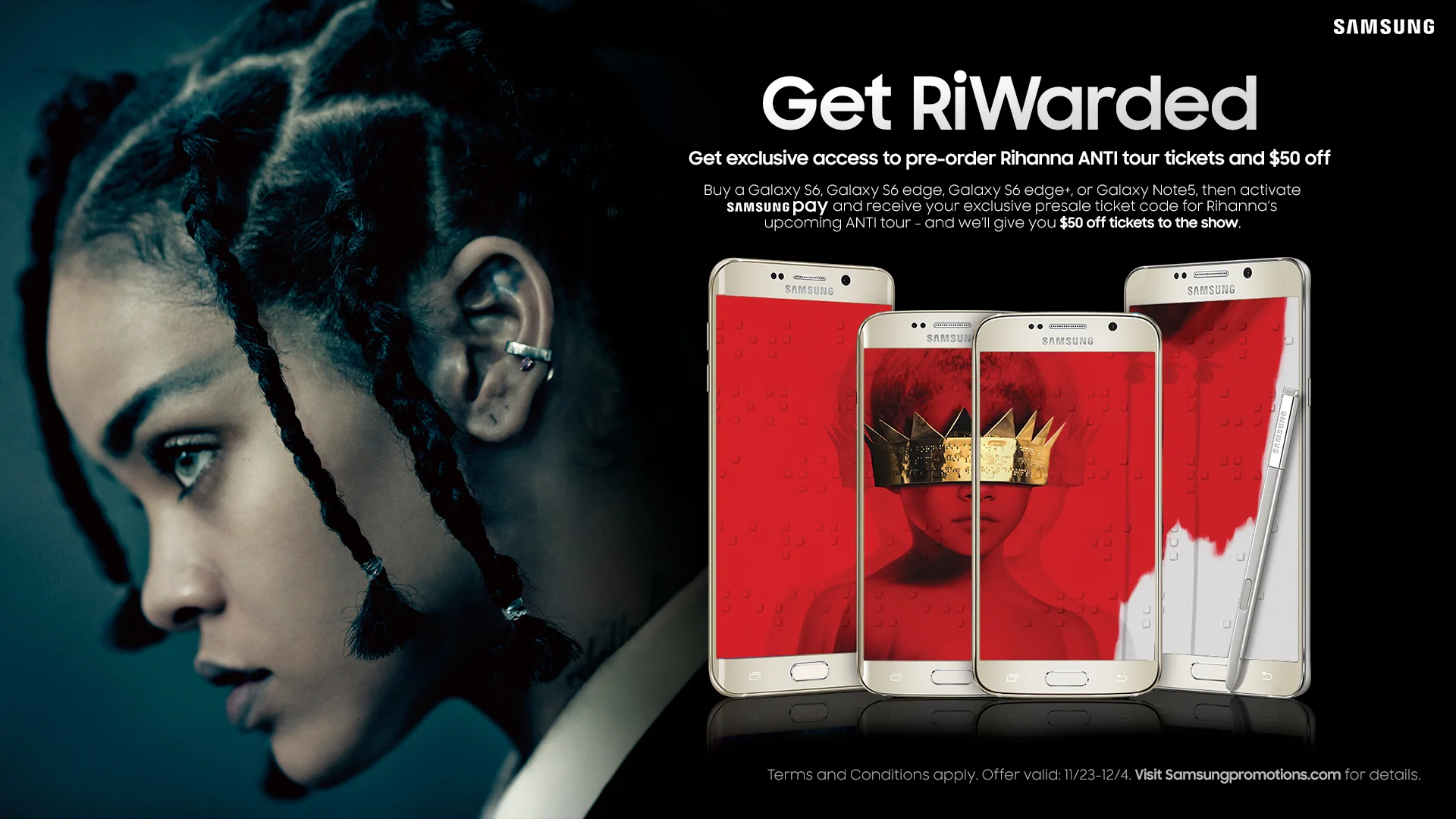 Conceptual creative for Rihanna x Samsung ANTI album release concert ticket sweepstakes with purchase of a qualifying device. Holiday 2015.